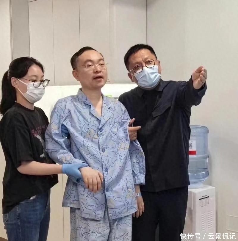 照片里,他身穿一件宽松的黑色外套,左右两侧分别由妻子段睿和助理搀扶前行。